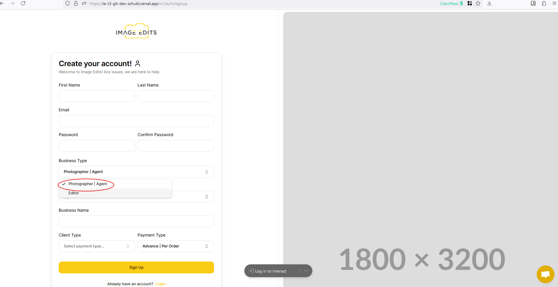 Prerequisite: You can't already be signed up and logged in with Image Edits, otherwise it will redirect you to your account.
