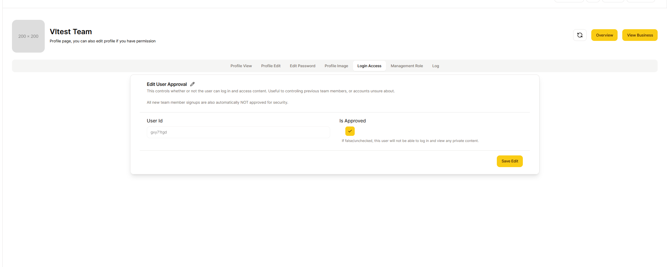This section will guide you through the process of adjusting user log in access to the platform. If the users isnt approve to access the platform, they will be rejected on log in attempt, (even if details are correct).