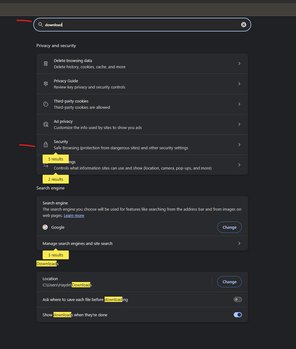 In the settings search bar, type "Downloads", then select the Security option.