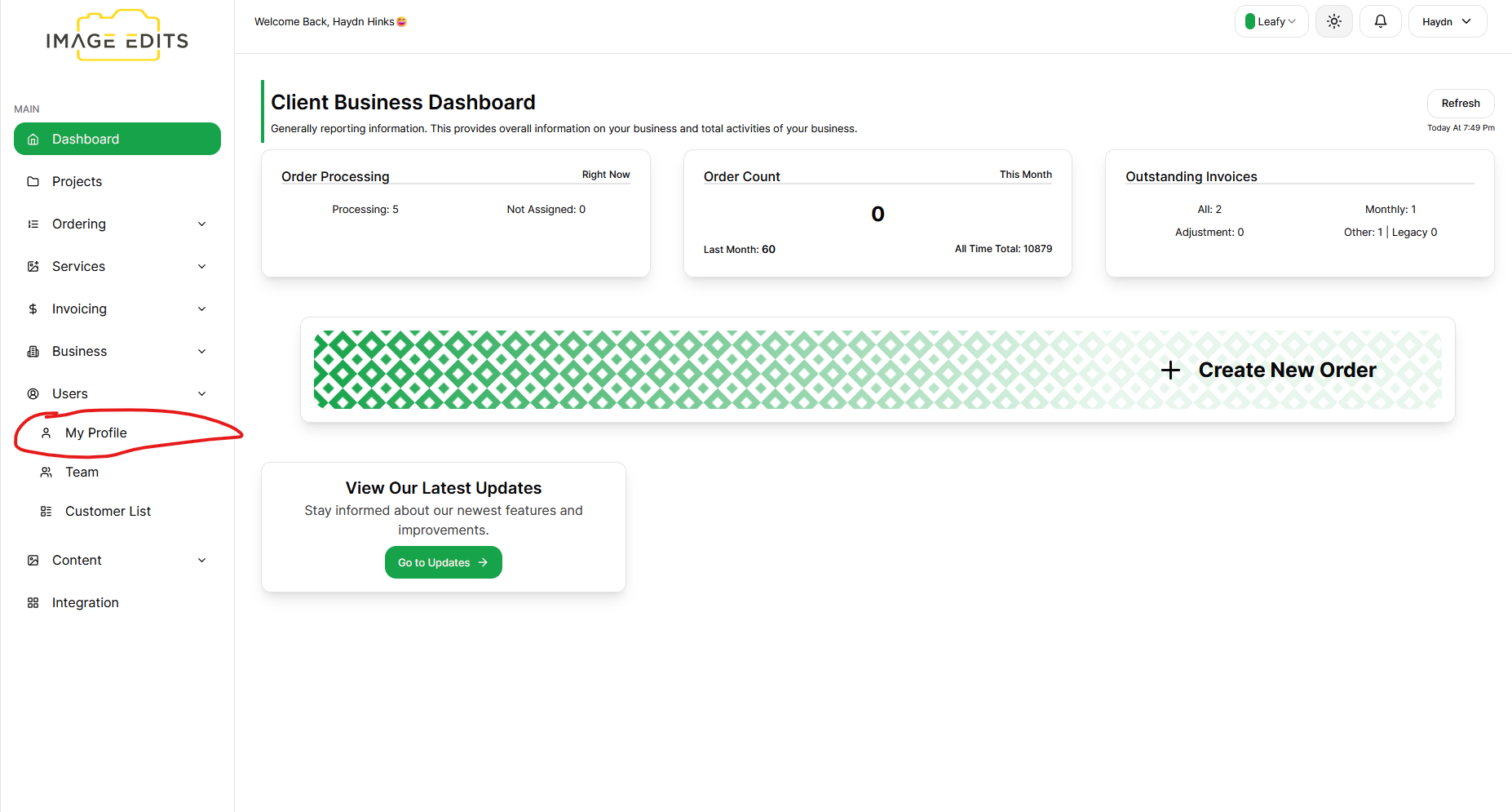 After clicking the users - My Profile, Team and Customers List will appear. Select My Profile menu item. (Or if business owner, you can go to the Team to select the team user you would like to edit profile of.)