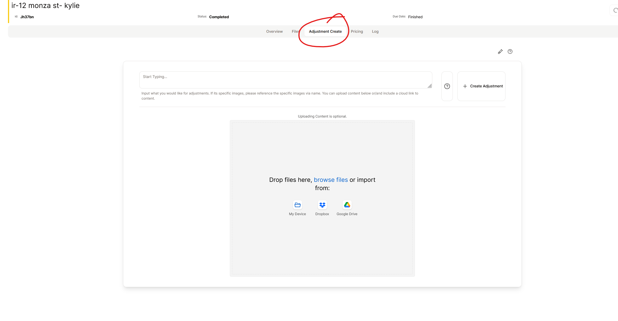 In the above image, on the right hand side you can see all adjustments requested and the status of each adjustment. You can only have one adjustmen processing at a time. So specify everything you need adjusted in each adjustment. In the Adjustment Section: