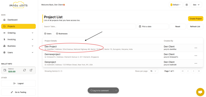After creating a project, the project list below will be updated with your newly created project. Click on this project to nagivate to the project detail page.
