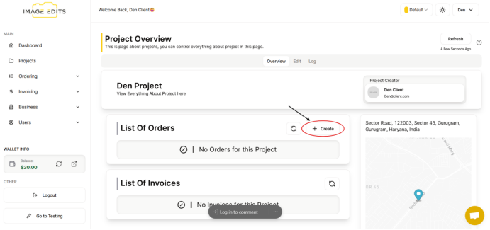 Once youve nagivated to the project detail page, you can start order creation from the project page, buy clicking the "+ Create" button in the section called "List of Orders".