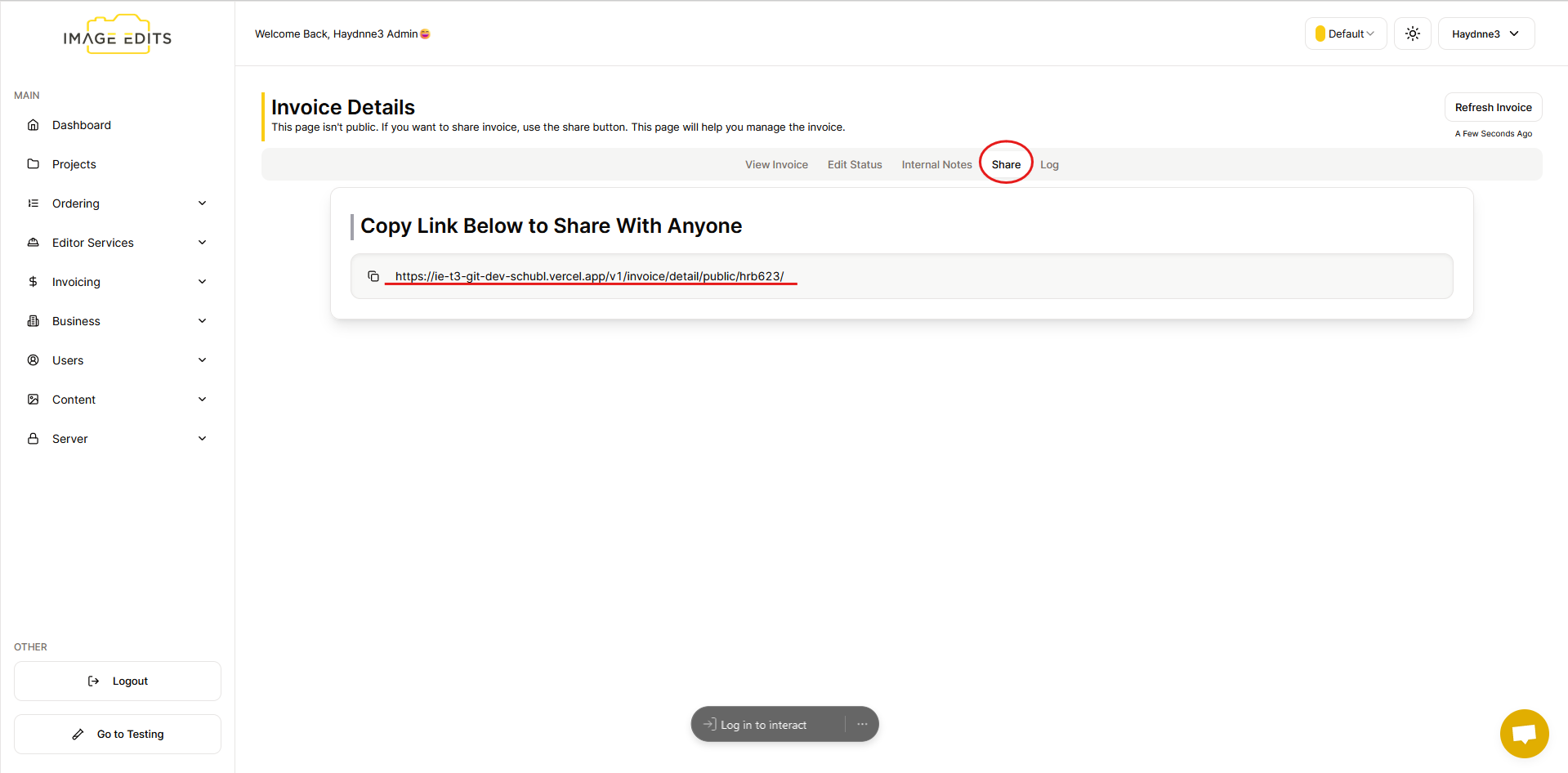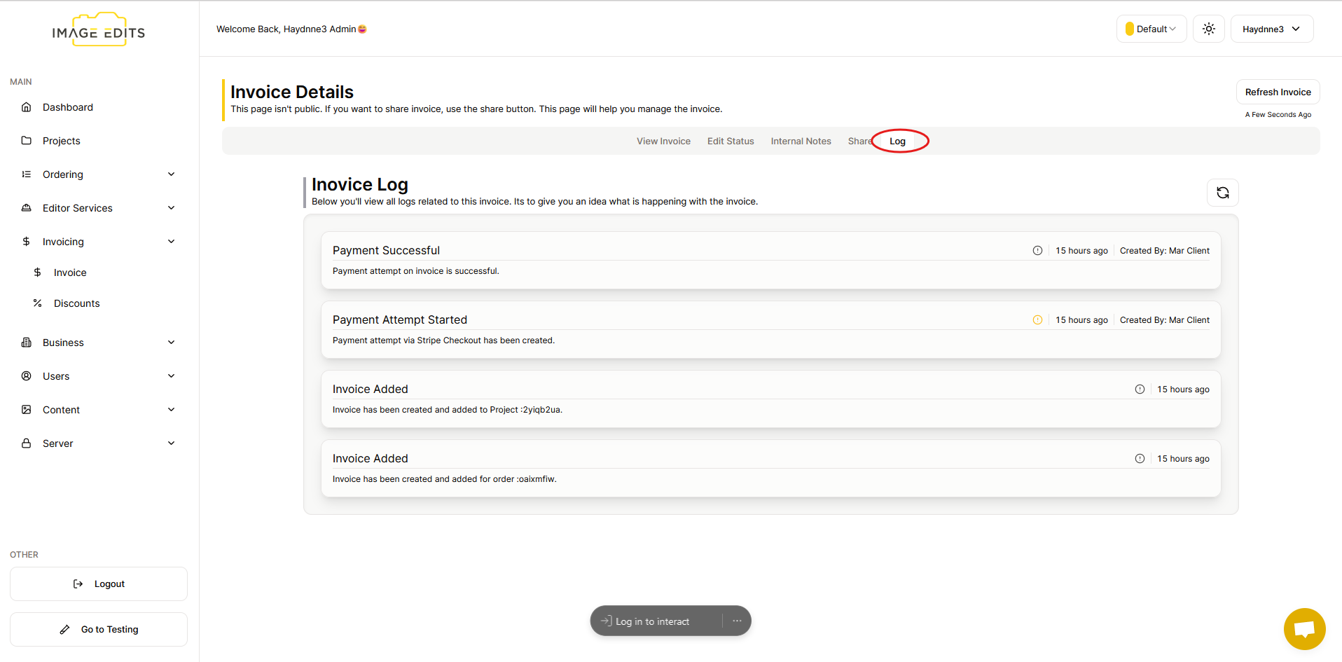 Next one is the "Log" section which typically refers to a record or history of invoices that have been generated, sent, or received. It can include details such as invoice numbers, dates, amounts, status (e.g., paid, pending), and any related notes or actions taken on each invoice. This currently is only visibly to the invoice creator.