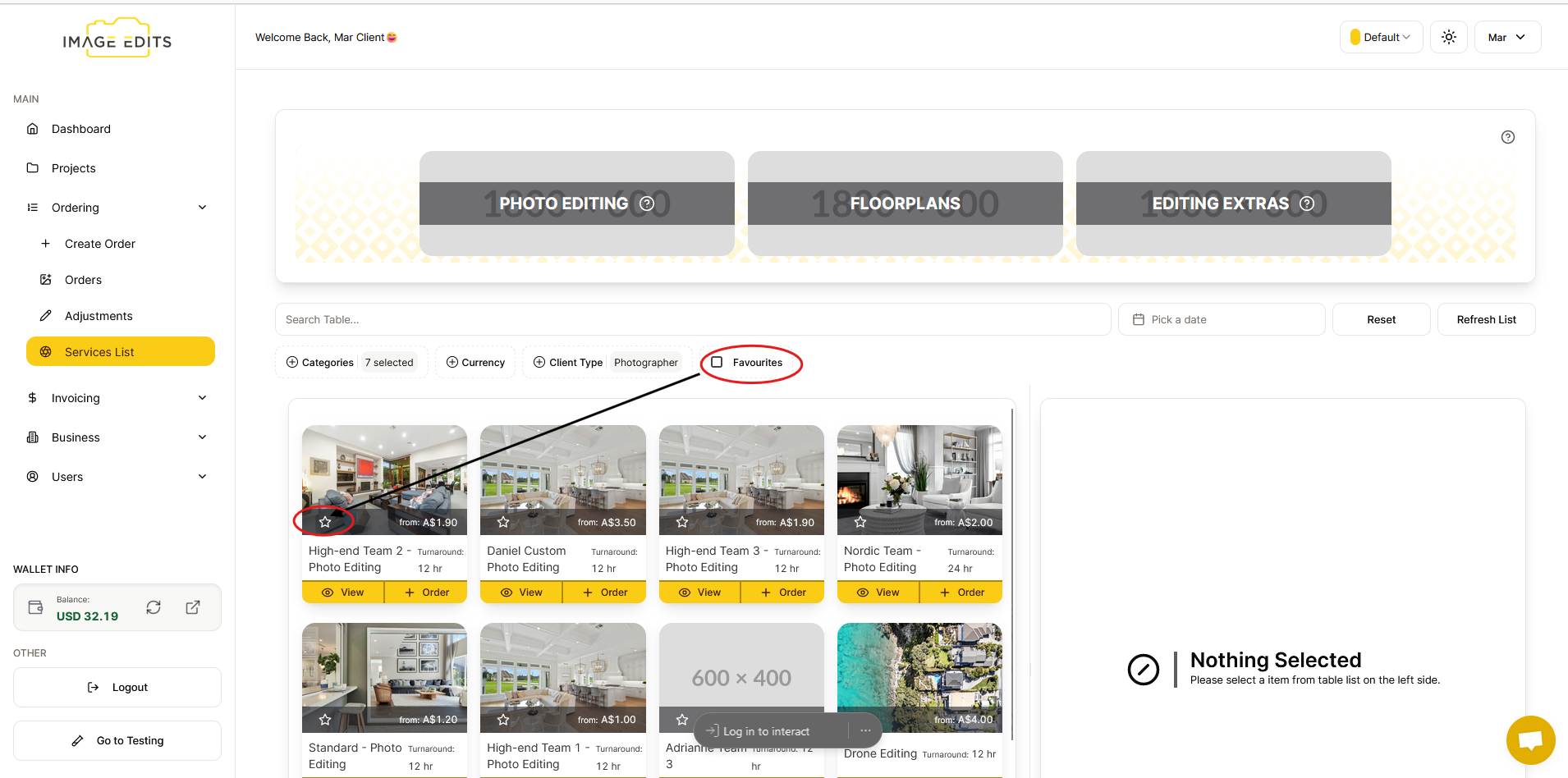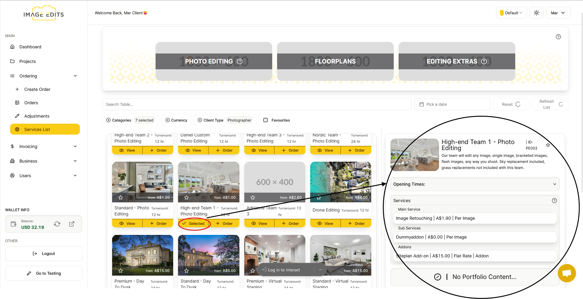 To view details, simply click the "View" button. After that, the details will appear on the right side, explaining the services and providing a brief description of the order.